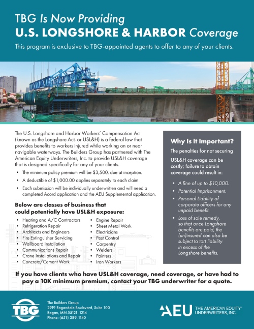 provides benefits to workers injured while working on or near navigable waterways. TBG has partnered with The American Equity Underwriters, Inc. to provide USL&H coverage that is designed specifically for any of your clients. If you have clients who have USL&H coverage, need coverage, or have had to pay a 10K minimum premium, contact your TBG underwriter for a quote.